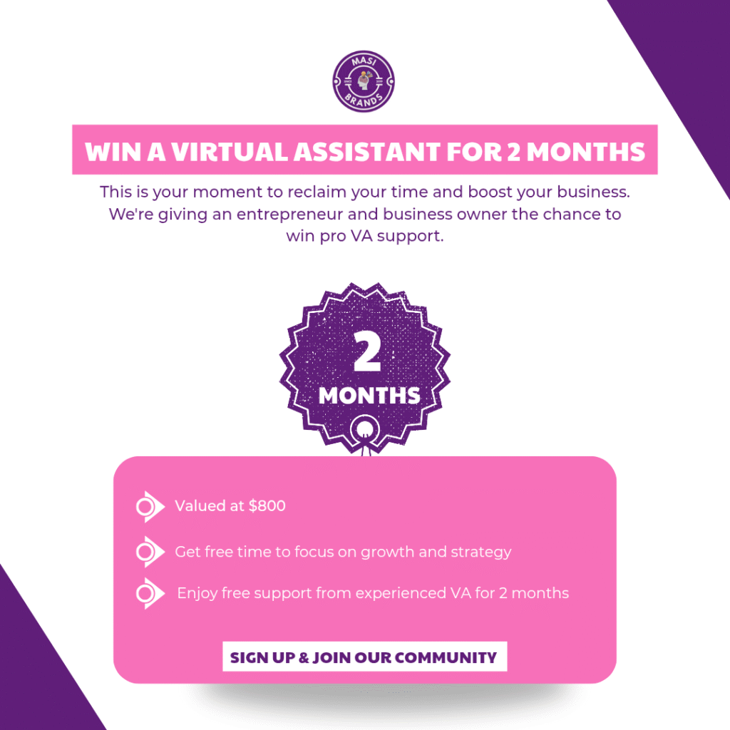 That’s why Masi Brands LLC is giving one lucky entrepreneur the ultimate gift: a trained, background-checked Virtual Assistant who will support you for 60 days at no cost.